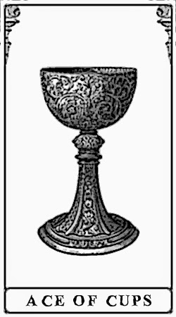 This picture that Mrs. Q put on the document she sent us is a tarot card, specifically the Ace of Cups. I couldn't find the same one that she had but this one is pretty close and has the same key features. The version Mrs. Q gave us is different than most of the Ace of Cups cards I found using the Google. I'm not sure if she did this on purpose but I'm going to talk about both versions because the meaning of the card depends on the version.